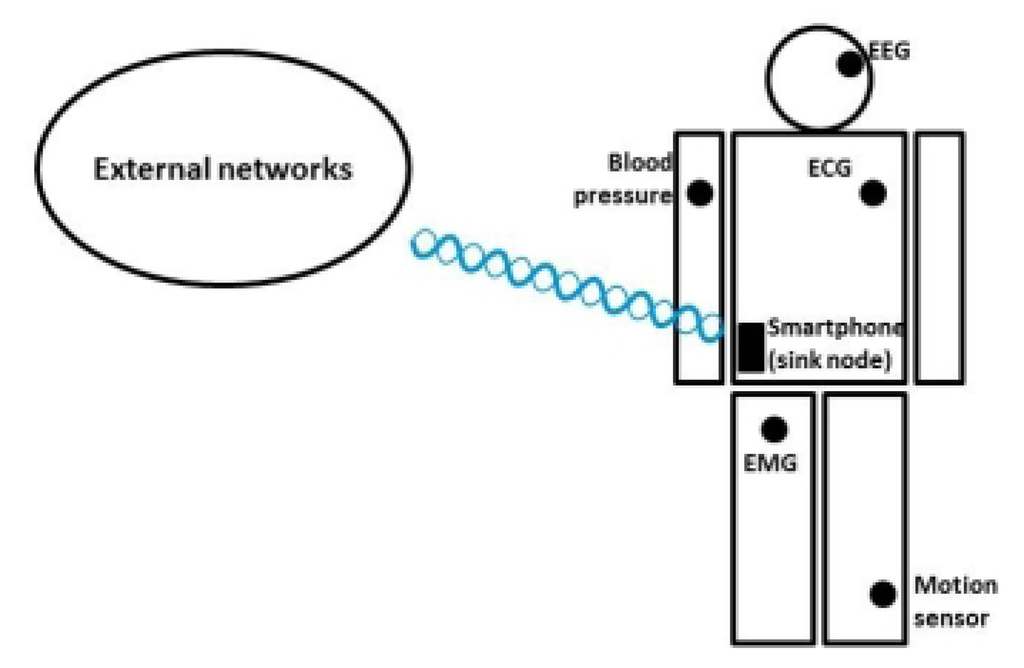 A WBSN consists of one or more sensor devices positioned on, in or around the human body. The sensor devices sense and collect data from the human body and then transmit the data to a central device, called a sink, that can be in the form of a smartphone or PDA. After collecting all information, this sink then forwards the data to the medical workers through external networks. A general example of WBSNs is shown in Figure 1.