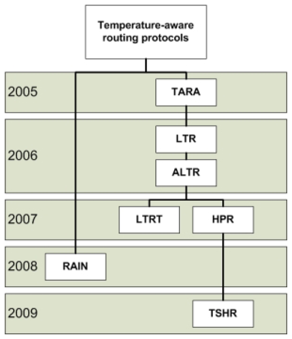 The performance of the above mentioned protocols were evaluated and compared in terms of maximum temperature rise, average packet delivery delay and packet drop rate in Figure 1, Figure 2 and Figure 3 of the work [25], respectively. The shortest hop routing (SHR) protocol was evaluated as the representative of non-temperature-aware routing protocols, and the four temperature-aware protocols of TARA, LTR, HPR and TSHR were evaluated quantitatively.