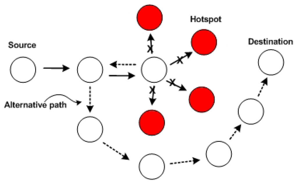 When the hotspot node is an intermediate node, the packet will be routed through a different path and, thus, avoid the hotspot area. This strategy is called withdrawal strategy, which operates as follows. If the next hop node is a hotspot node, the node will check into the forwarding set of this route whether there is any other available next hop node to send the packet to. Should there be no more available next hop nodes, the packet will be forwarded back to the previous node. This previous node will try to forward the packet using an alternative path or might again forward it back to its previous node. The information about hotspot nodes is carried by the packet when the withdrawal strategy is used. A sample of how TARA works is shown in Figure 3.