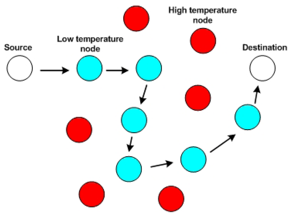 LTR, or the Least Temperature Routing protocol [22], is developed based on the TARA protocol. The setup phase is similar to that of TARA: every node communicates with its neighbors and gathers information about their temperature by observing their activities. The improvement lies in how the packet is forwarded in the network. Unlike TARA, which buffers the packet if the destination node is a neighboring node, LTR forwards the packet directly to the destination node. Additionally, as its name implies, in LTR, each node tries to forward the packet to the “coolest” neighbor since the beginning of transmission from the sender node. There is also a packet-discarding mechanism, in which a parameter, named MAX HOPS, is defined, and if the received packet's hop count exceeds this value, the packet will be dropped. The purpose of this mechanism is to prevent a packet from going around the network too far. Another mechanism to reduce unnecessary hops and loops is also presented. If the “coolest” neighbor has been recently visited, the packet will be forwarded to the “second coolest” neighbor. To support this mechanism, a list of recently visited nodes within some time window is included in the packet. Figure 4 shows a sample of how the LTR protocol works in the network.