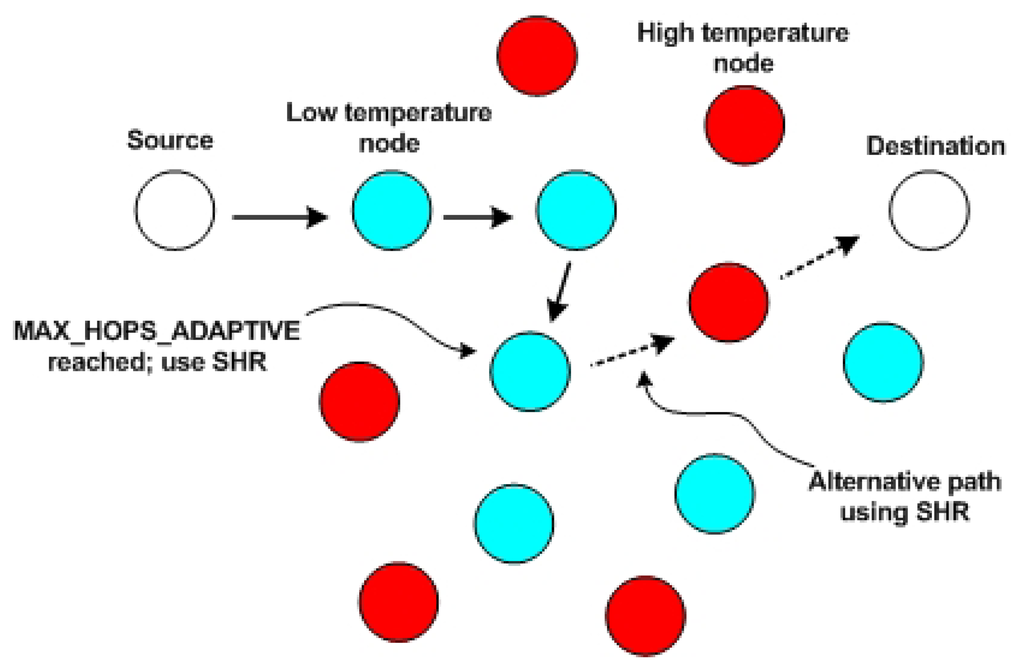 ALTR, or Adaptive Least Temperature Routing [22], is the adaptive form of LTR. A new parameter, named MAX HOPS ADAPTIVE, is presented by this protocol. Each time a packet is received by a node, its hop count value is examined. If the value is lower than MAX HOPS ADAPTIVE, then the packet is routed in the same way as LTR. However, as shown in Figure 5, if the value is greater than MAX HOPS ADAPTIVE, instead of being dropped, the packet is routed using the shortest hop algorithm. ALTR also introduced a mechanism called “proactive delay” to reduce the temperature rise at the cost of the packet delivery delay. If a node receives a packet and has no more than two outgoing neighbors, such that its coolest neighbor has a relatively high temperature, the node delays the packet by one time unit before forwarding it to the coolest neighbor.