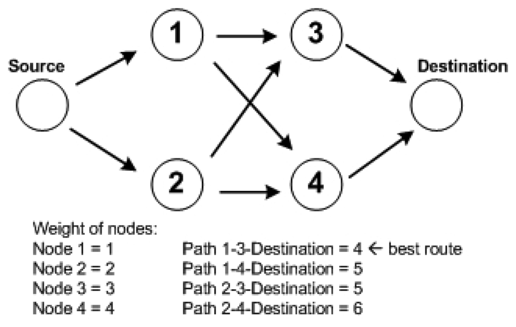 The algorithm of this protocol is briefly described as follows. First, every nodes collects the temperature information from its neighboring nodes and, then, builds all possible routes to the destination. Then, it assigns temperature as a weight to each intermediate node and builds a weight graph. On this graph, it applies the Djikstra's algorithm to solve the single source shortest path (SSSP) problem of the weight graph. The result is a path that has the lowest temperature metric. A sample of this graph is shown in Figure 6. That being said, since the beginning, LTRT tries to look at the end-to-end connection perspective, instead of the connection between two directly connected nodes only. It tries to select the least temperature route from every possible route.