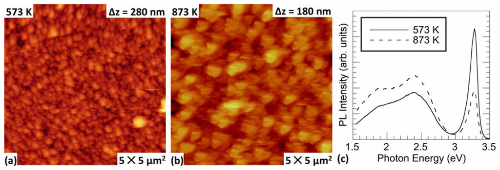 Figure 1a,b shows the surface morphology of the resulting ZnO films annealed at 573 and 873 K, respectively. The as-grown zinc film demonstrates a high surface roughness and approximately 100 nm diameter protrusions (not shown). There is no significant change in surface morphology between the annealed Zn-metal films and the oxidized films at this annealing temperature, where pre-oxidation Zn-metallic films exhibit similar morphology to that seen in Figure 1a. However, an increase in protrusion diameter and surface roughness is observed with increasing annealing temperature, as seen in Figure 1b. This change in surface morphology is consistent with other studies [10].
