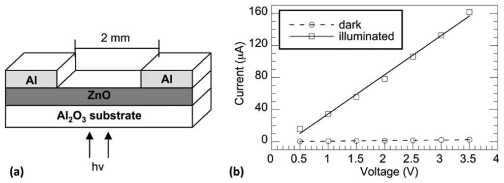 Figure 2a shows a schematic diagram of the fabricated UV photodetectors having an Al:ZnO:Al MSM planar structure. Metallic Al contacts with wide spacing (1–2 mm) were deposited on the ZnO surface via sputter deposition using a shadow masking technique. Narrow spacing (0.2–0.5 mm) contacts where deposited via a mask-less photolithography process. Aluminum targets were obtained commercially and had a purity of 99.99%. Film surfaces were cleaned similarly to substrates, as detailed above. Aluminum contacts were sputter deposited at approximately 20 W for 30 min, resulting in a contact thickness of approximately 200 nm. Photodetectors were backside illuminated. Although contact spacing and geometry did affect the photoconductivity of the fabricated devices, in this study, we are interested in the normalized photocurrent transients, which we have shown do not depend on these properties [18].