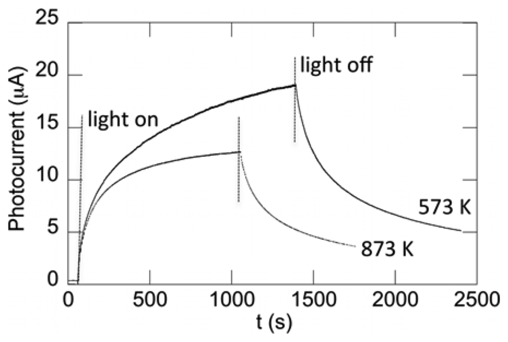 The photoluminescence of ZnO has been shown to include yellow, green, blue and UV emission, depending on the environments and annealing conditions in which the films were grown, and annealing temperature heavily influences PL spectra [11,12,29]. Figure 1c shows the PL spectra for the ZnO films thermally annealed at both 573 and 873 K. Spectra show asymmetric broad bands in the yellow-green region. A more narrow band in the UV is observed, which is associated with excitonic emission. It is generally accepted that the green and yellow emission results from the recombination of a delocalized electron close to the conduction band with a deeply trapped hole in the single ionized oxygen vacancy and the single negatively-charged interstitial oxygen ion centers in the bulk, respectively [33,34]. Reduction in optical quality is observed with increasing annealing temperature, which results in decreased photodetector performance. Specifically, the ratio of excitonic-to-green emission is seen to decrease, where Figure 1c shows increasing green band emission and decreasing excitonic emission with increasing temperature. This is discussed in greater detail in reference [18].