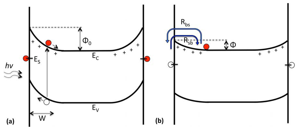 We are interested in the rate of conduction band electron transfer, since the photogenerated conduction band charge carriers are the main contributor to the photocurrent. The rate of surface-to-bulk transfer is strongly dependent on the time-dependent band bending, Φ, which, in turn, depends on the density of charged surface states, ns. From Equation (2), we find: