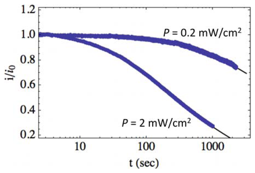 Figure 5 shows the normalized photocurrent relaxation transients for the same sample UV illuminated at P = 0.2 mW/cm2 and P = 2.0 mW/cm2 (filled circles). Greater illumination intensity results in a faster normalized relaxation, where the normalized photocurrent is seen to decrease 40% more in the same time period when intensity is increased by an order of magnitude. Equation (11) is fitted to the data shown in Figure 5 and is shown as the solid lines, with fitting parameters, A = (1.5, 1.5) × 10−2s−1, B = (3.1, 3.1) × 10−4s−1 and β = (0.25, 0.63) for P = (0.2, 2.0) mW/cm2. For the native band bending, we use Φ0 = 0.3 eV. We have also chosen η = 2, which corresponds to significant trapping in the depletion region and deep surface traps [17,28,40]. However, it should be pointed out that Φ0 and η could be different while maintaining the fit, so long as the ratio between the two values remains constant. This provides a range of values for Φ0 from approximately 0.1 to 0.3 eV for η from 0.5 to two. Reported values for the native ZnO surface band bending vary significantly depending on the environment and structure. Apparently, there is no band bending for a clean ZnO surface cleaved in ultrahigh vacuum [41]. In ambient air, however, chemisorption of oxygen results in band bending and electron transfer from the semiconductor to oxygen molecules or atoms, with the rate of electron transfer proportional to the oxygen pressure (10−3 to 20 Torr) [42]. Under illumination in vacuum, desorption of oxygen takes place, resulting in a surface photovoltage of up to 0.3 eV for single crystal ZnO [42]. Annealing causes the chemisorption of oxygen and a change from 0.2 eV of downward band bending to 0.3 eV of upward band bending [43,44]. However, very large surface band bending of ∼1.54 eV has been reported for ZnO nanowires, where the persistent photoconductivity is due to the spatial separation of photoinduced electrons and holes in the ZnO nanowire [45]. Native surface band bending for our thermally annealed films is consistent with the lower values reported for single crystal studies, even though our films demonstrate relatively large grain size (∼100–300 nm). In Section 4.3, we also determine an approximate value for the surface state energy, Es, that suggests η ≈ 2.