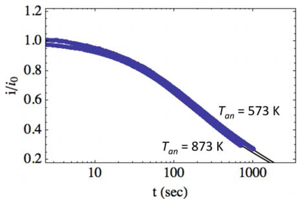 Figure 6 shows the normalized photocurrent transient relaxation for photodetectors having varying base film annealing temperatures (Tan, filled circles). As discussed in Section 2.1 and shown in Figure 1, grain size is seen to increase, and optical efficiency decreases with increasing annealing temperature, which is discussed in detail in previous work by our group [18,29]. To determine if these properties contribute to the transient relaxation, we fit Equation (11) to the data in Figure 6 and show the fits as solid lines. The fitting parameters were found to be A = (1.5, 1.5) × 10−2s−1, B = (3.1, 3.5) × 10−4s−1 and β = (0.63, 0.67) for Tan = (573, 873) K, respectively. There is no significant difference between fitting parameters for the two detectors.