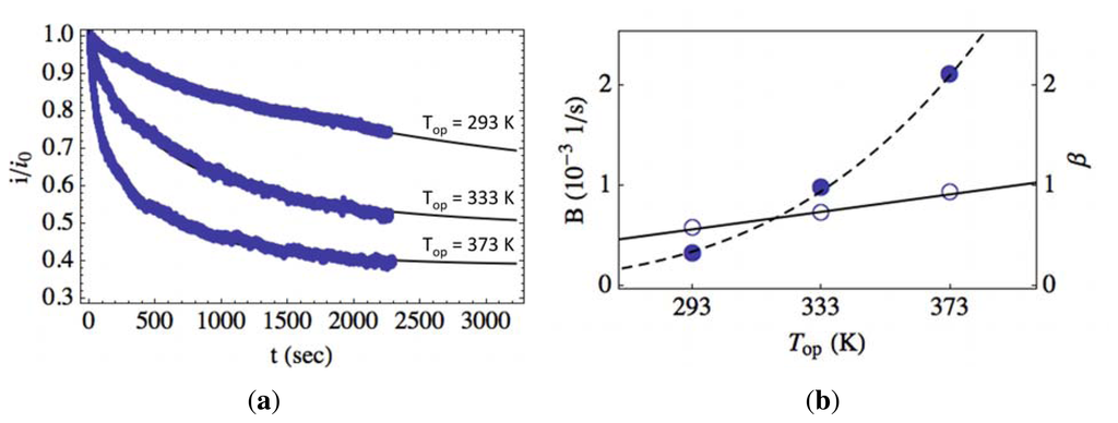 Figure 7b shows the fitting parameters, B (filled circles) and β (hollow circles), plotted as a function of operating temperature. The fitting parameters as a function of temperature are fitted to an Arrhenius (dashed line) and linear (solid line) model for B and β, respectively. With increasing temperature, β is found to increase approximately linearly. This is consistent with the assumption that the density of photogenerated charge carriers is approximately proportional to the illumination intensity.