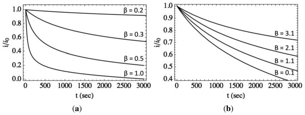 Figure 8b shows the normalized photocurrent transient relaxation according to the model with varying values of B at room temperature and fixed values of A and β. The parameter, B, represents the surface-to-bulk contribution to the normalized photocurrent relaxation rate and includes information about the capture of charge at the surface. As B decreases, the rate of normalized photocurrent relaxation increases for t > 1, 000 s. This corresponds to either significant trapping of charge, reducing the ability of charge to transfer away from the surface, or a low probability of transfer, due to a relatively high energy barrier. In Figure 7a, we see the slope of i/i0 as a function of time for t > 1, 000 s decreases with operating temperature. This is due to a decrease in surface charge trapping and/or an increase in transfer probability, due to the increase in thermal energy. Lower temperature results in lower probability of charge transfer over/through the barrier and could result in greater trapping by absorption of oxygen at the surface, for example, which leads to faster relaxation, due to the bulk-to-surface charge not competing with incoming surface-to-bulk transfer.