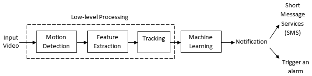 A summary of event recognition related review papers that involve various human activities or actions is provided in Table 1. These papers highlight the typical framework that is used in visual surveillance systems, which comprise detection, feature extraction and classification. In contrast to these papers, our review is aimed at sudden event recognition systems. Sudden event recognition is a subset of abnormal event recognition that requires instant mitigation. Because of the rapid development in event recognition systems [5–7], our survey focuses on low-level processing aspects of sudden event recognition. Figure 2 depicts the overall structure of video-based sudden event recognition, which is presented in this survey paper. Initially, the accuracy of most event detection, either sudden or non-sudden, depends on the effectiveness of the low-level processing, which involves motion detection, object recognition and tracking techniques. The extracted low-level information is then used to design a sudden event recognition system, and finally, a machine learning approach is used to recognize the sudden event.