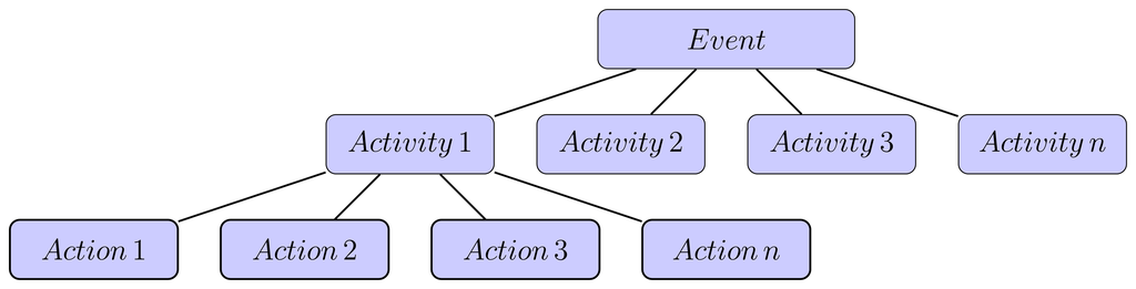 Figure 3 shows the relationships of the levels in the semantic hierarchy, which is composed of “event”, “action” and “activity”. These terminologies were adopted from Govindaraju et al. [23], who stated that “event” is the highest level of the hierarchy, followed by “activity” and “action” occurrences in a video. These definitions are also in line with the description by Nagel [24], who put “event” at the top of the semantic level relationships.