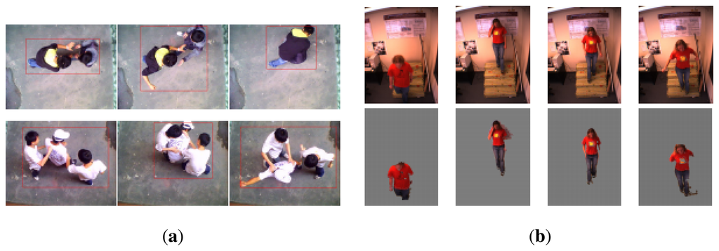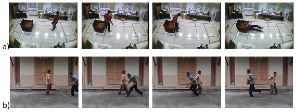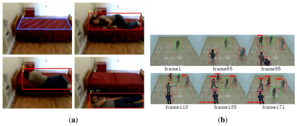 Figure 6. Example of a human-centered sudden event. (a) Patient falls out of bed. ©2011 IEEE. Reprinted, with permission, from [33]; (b) group interaction shows the sequence of a sudden assault. Reproduced with permission from [34]. With kind permission from Springer Science and Business Media.This event comprises behavior that involves only a single person without any interaction with another person or vehicle, e.g., a patient's sudden fall out of his bed or an elderly fall at a nursing home.