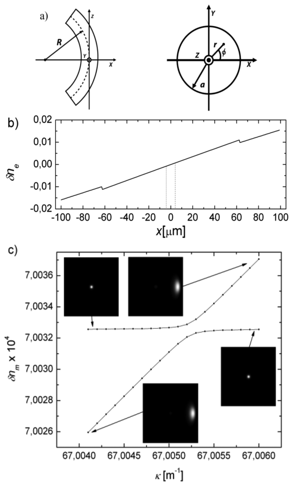In Figure 1c, we can see the first resonant coupling by plotting the modal index deviation, δnm, with respect the fundamental mode index at κ = 0, λ = 1,550 nm, as a function of curvature, when the fiber loop is surrounded by air. This coupling corresponds to the original modes LP01 and LP02. The fields of mode LP02 are already strongly distorted by the perturbation. One can follow easily the dispersion curve of the fundamental mode and the higher order cladding mode around the anticrossing point.