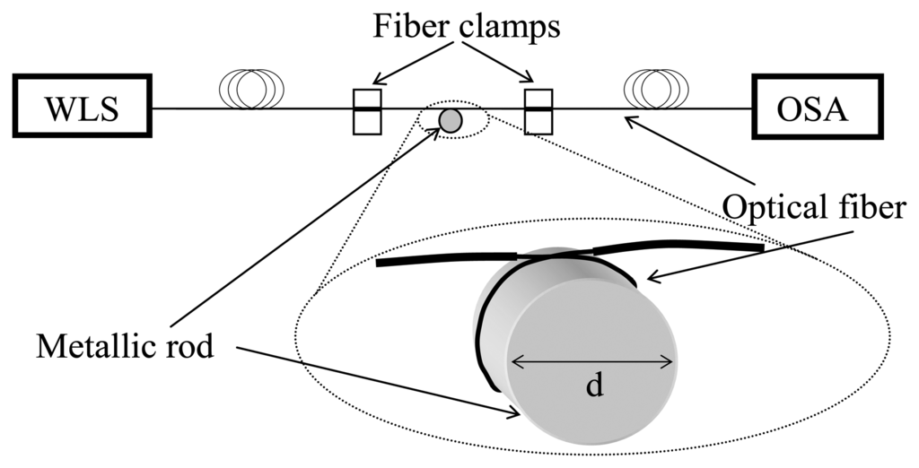The experimental set-up used to test the proposed RI sensor is shown in Figure 2. The sensor head consists of a small loop of bare optical fiber (SMF-28). The fiber is coiled around a metallic rod with a diameter d, which determines the radius of curvature of the fiber, R = d/2. This metallic rod is a support for the fiber loop, to ensure a constant radius of curvature, but has no influence in the optical response of the device since the fields of the guided modes are pushed towards the outer part of the fiber because of the curvature. All our experiments were carried out using rods with diameters around 12 mm. The polymer coating of the fiber was removed by sinking the fiber during few minutes in a methyl chloride solution, avoiding the use of a mechanical stripper in order to ensure no damage of the fiber surface. The transmission spectrum of the fiber previous to bending was used as a reference signal to normalize the transmission spectra obtained when the fiber loop is formed and immersed in different refractive index solutions.