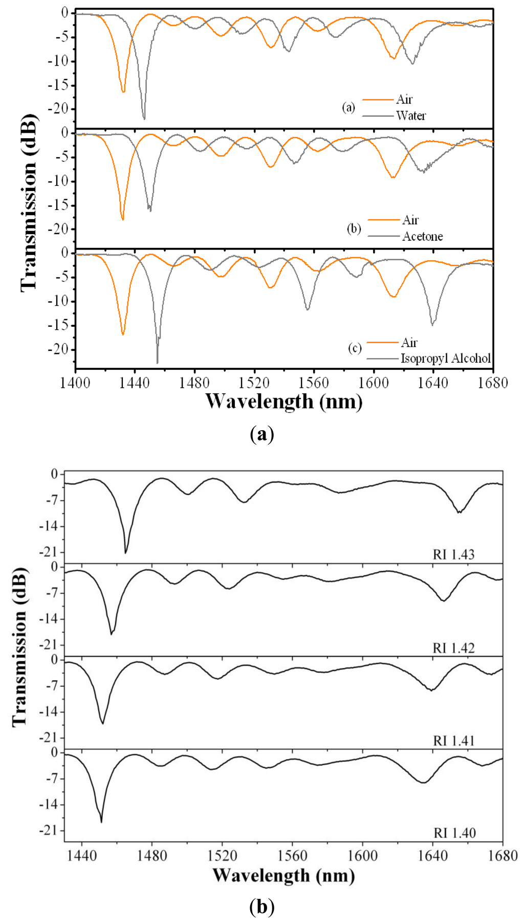 Between consecutive measurements, the fiber loop was cleanedwith acetone and then dried with air. As an example, Figure 4a gives the transmission spectra whenwater, acetone and isopropyl alcohol were applied, while in Figure 4b we show the transmission spectra for four different RI liquids. The wavelength ofeach resonant coupling shift towards longer values as the refractive index of the external medium augments. A more detailed calibration is given in Figure 5 for the strongest experimental coupling, the one located at 1,432 nm when the fiber is surrounded by air.