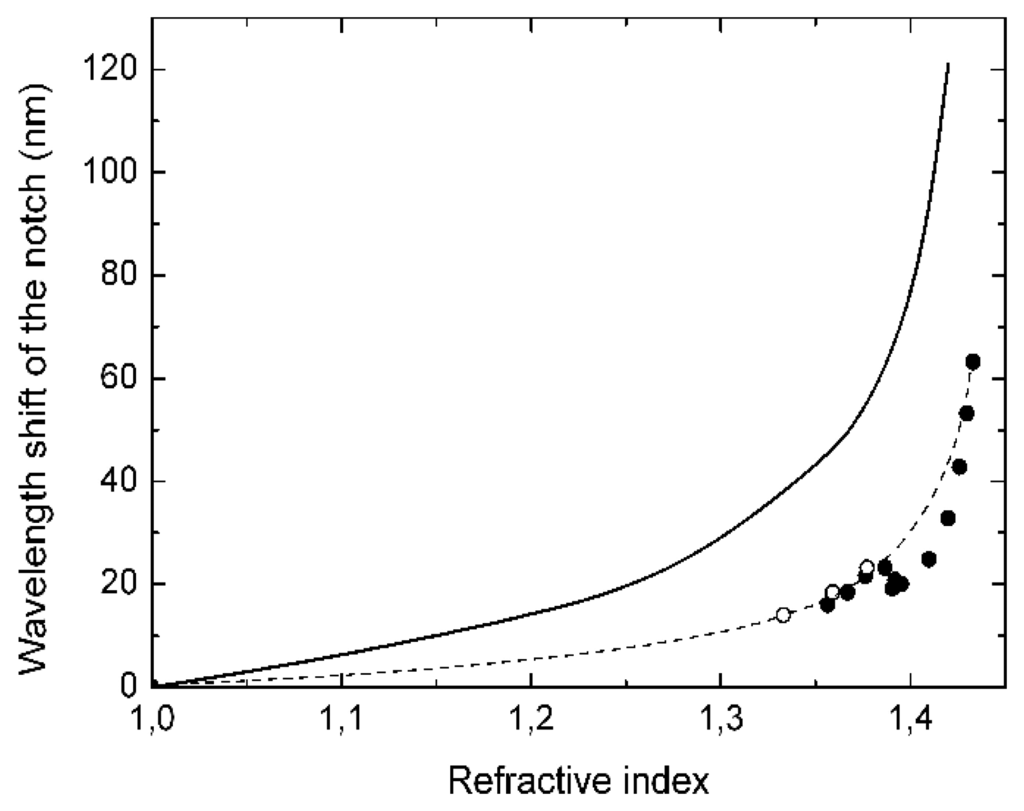 Temperature effects are an important issue for any refractive index sensor. A detailed simulation has been carried out in which the thermal expansion of both the core and cladding radii have been taken into account (αT = 0.55 × 1−6 K−1), as well as the thermo-optic coefficients of the Ge-doped core (∂ncore/∂T = 1.15 × 10−5 K−1) and the pure silica cladding (∂nclad/∂T = 1.06 × 10−5 K−1). The theoretical estimation is a drift of 0.1 nm/K, towards shorter wavelengths, for the resonant couplings shown in Figure 3. Such a small drift is comparable to the resolution, so it can be considered negligible provided the measurements are carried out maintaining a constant temperature within ±1 K.