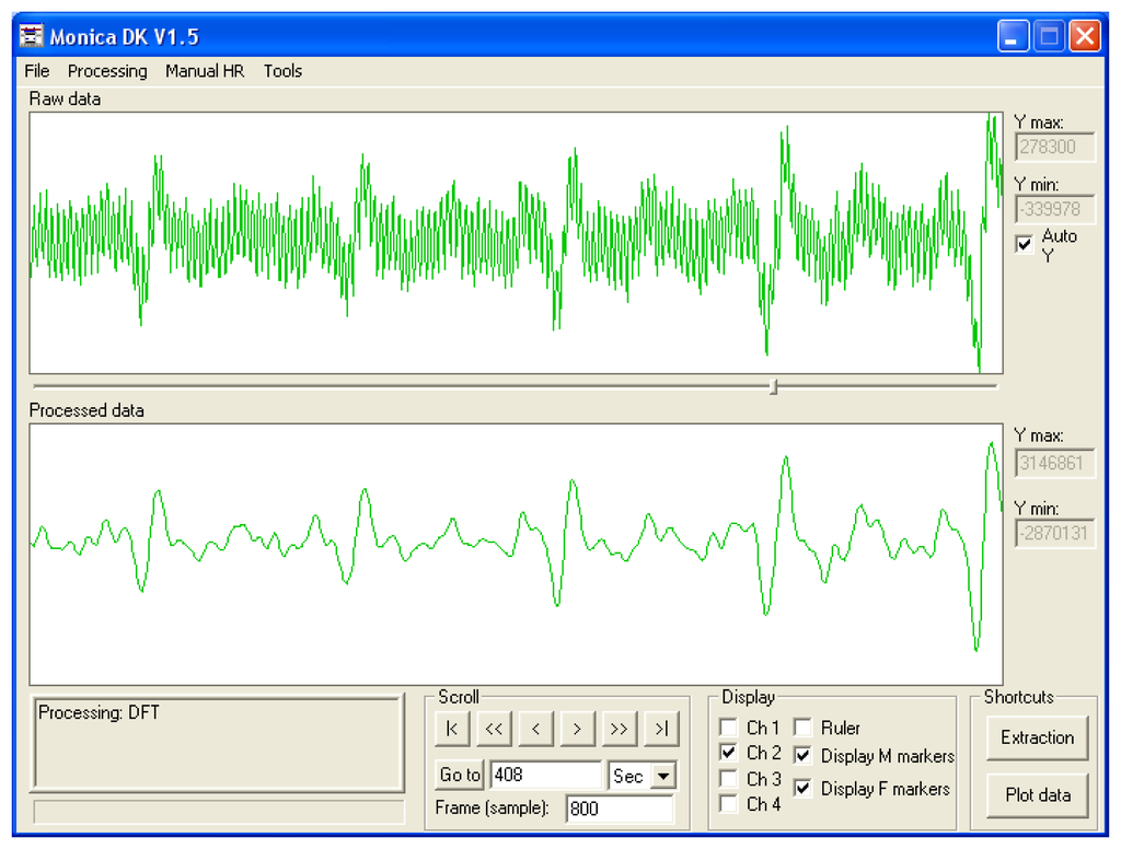 Following satisfactory safety testing on test objects, the volunteer study was initiated. No safety issues were encountered using the device to record the fECG during fetal imaging on the pregnant volunteers. The gating system was present for all imaging sequences. Figure 5 shows raw and Finite Impulse Response (FIR)-filtered (4 Hz–45 Hz bandpass provided with the Monica Healthcare software) ECG data acquired in the magnet without imaging gradients present clearly showing mECG and fECG components at different rates. The mECG was approximately 80 bpm and the fECG was approximately 140 bpm for all three volunteers and foetuses.