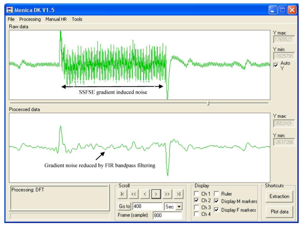 Figure 6 illustrates the effects of burst of gradient waveforms from a single shot spin echo sequence on the fECG trace. Filtering, as contained in the fECG hardware largely removes the effects of this rapid train of pulses.