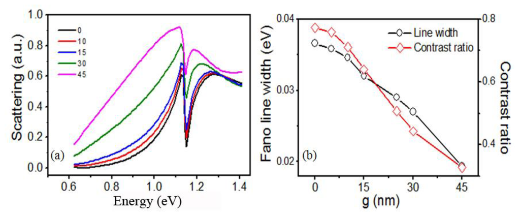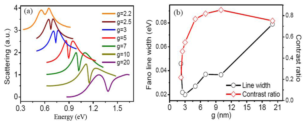 Figure 3a shows the influences of the nanogap g between the nanoring and the inner nanodisk on the quadrupolar Fano resonance. As the gap widths decrease from 20 to 2.2 nm, the Fano resonance peak gradually red shifts from 1.383 to 0.605 eV. However, Fano linewidth decreases greatly from 0.079 to 0.0187 eV when the gap decreases to 3 nm, and it increases abruptly to 0.0459 eV as the gap further decreases to 2.2 nm. The contrast ratio of Fano resonance increases gradually to 85%, and then decreases greatly to 22% as the gap decreasing from 20 to 2.2 nm, as shown in Figure 3b.
