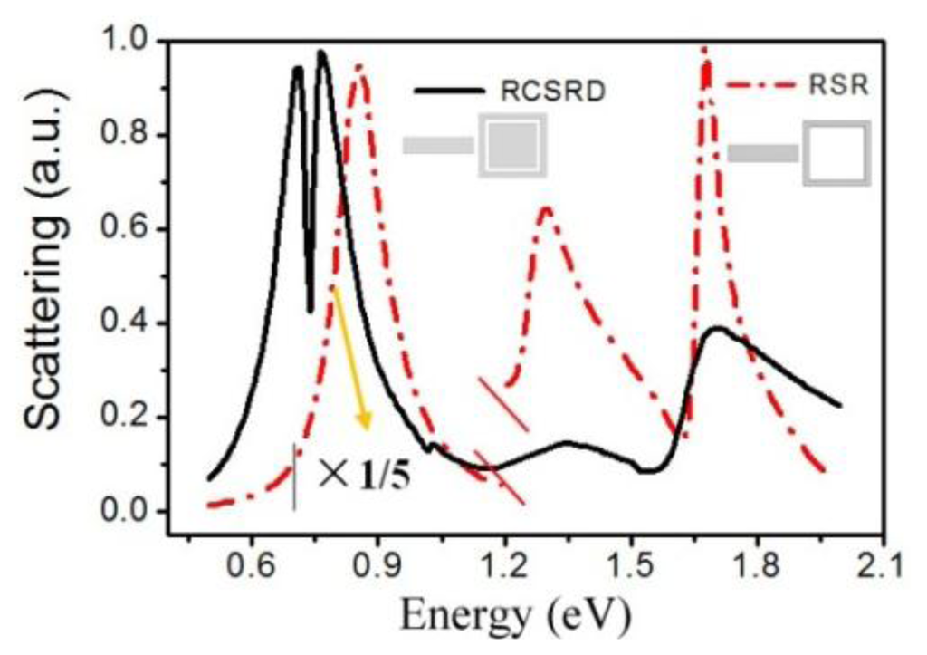 Figure 2 shows the scattering spectra of RCSRD and the rod-square ring (RSR, i.e., the RCSRD nanostructure without the inner square disk). In the calculation, the nanorod length a and width b are 450 nm and 60 nm, the gap width g between ring and disk of CSRD is 3 nm. For the RSR nanostructure, the nanorod length a is chosen as 180 nm for optimal match between nanorod and nanoring, other parameters are same as the RCSRD. In the scattering spectra of these two nanostructures, the quadrupolar Fano resonances are at 0.737 eV and 1.628 eV, respectively. Fano linewidth of RCSRD is 0.0187 eV, which is only 1/13 of the RSR nanostructure. There is a resonance peak at 1.71 eV in the scattering spectra of RCSRD, which comes mainly from the quadrupolar resonance of the CSRD. In the scattering spectra of RSR, there is a strong bonding mode at 0.86 eV, which comes from the primitive plasmon resonance of the rod and the ring. In Figure 2, this resonance peak is reduced to one fifth in order to show clearly the Fano resonances.