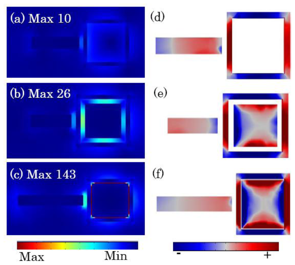 The combination of the primitive dipole resonance of the outer nanorod and the antibonding plasmon resonance of CSRD forms the broad bright mode. It interacts with the narrow dark quadrupolar mode of the square nanoring, and induces the formation of the quadrupolar Fano resonance dip in the scattering spectra, as shown in Figure 3a. Figure 4 shows the electric field distribution and the induced surface charges on the top surfaces at the quadrupole Fano dips. The dark quadrupolar mode of the RCSRD are excited strongly, and the dipolar mode of the outside rod is suppressed greatly. If the CSRD structure has no the central disk, the maximum electric field localizes in the gap between the outside rod and the CSRD structure, which can enhance it 10 times. However, when the ring becomes a CSRD structure, the maximum electric field localizes in the gap in CSRD. When the gap g is 5 nm, the maximum electric field enhances to 143 times, as shown in Figure 4c. The charge distribution of the outside nanorod in Figure 4d,e demonstrates that the dipolar mode is further suppressed as the inner nanodisk in CSRD becomes larger.