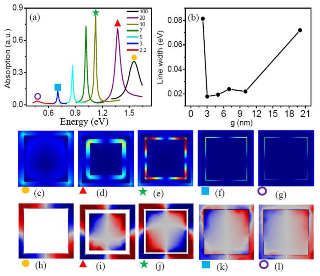 Figure 5c–g show the electric field distribution at the quadrupolar resonance peaks. If there is no the inner disk, the electric field distributes mainly out of the ring, as shown in Figure 5c. However, when a disk is put in the ring, the electric field intensity localizes strongly in the cavity because of the localized surface plasmon (LSP), as shown in Figure 5d,e. The line width decreasing originates from this LSP because it restrains the radiative damping. The localized surface plasmon results in the intensifying of the dark quadrupolar resonance as the gap g decreases to 10 nm. However, as the gap is less than 10 nm, the CSRD supports a hybrid mode (as shown in Figure 5k) consisted of a subradiant quadrupolar mode and a superradiant dipolar mode, so the intensity of the quadrupolar mode decreases. However, if the width g decreases to 2.2 nm, the subradiant quadrupolar mode changes to a superradiant dipolar mode, as shown by the surface charge distribution in Figure 5l. The strong radiative damping results in a drastic increase in the line width.