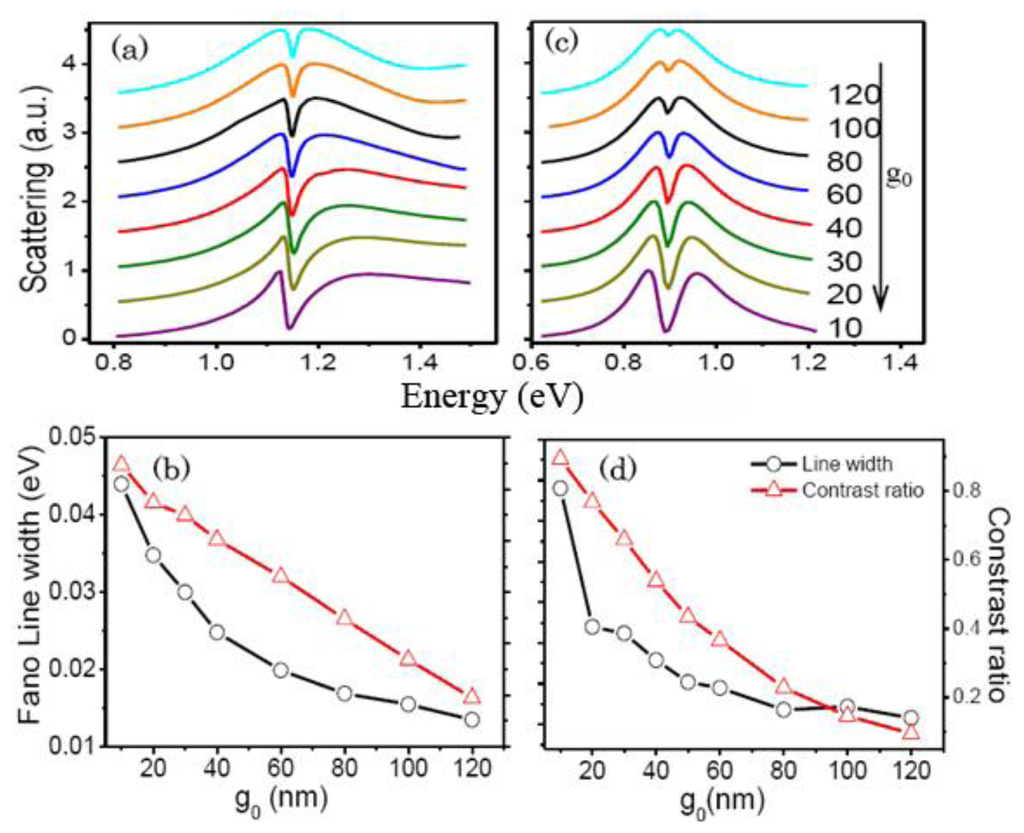 Figure 6 presents the influence of the nanogap g0 between the outer nanorod and the square nanoring on the quadrupolar Fano resonances. The Fano linewidth declines exponentially and the contrast ratio reduces gradually as g0 increases. The gap width g0 decides the coupling strength between the broad bright mode and the narrow dark mode. As g0 increasing, the coupling strength becomes weaker. As a result, the Fano dip becomes narrower and shallower, which accords with the results in [5].