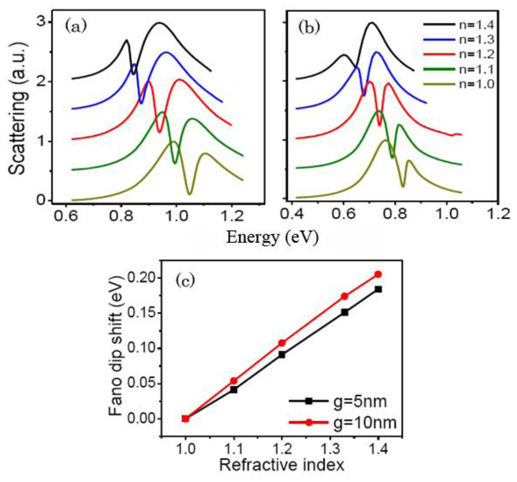 Metamaterials with the sharp plasmon resonances have broad practical applications such as active plasmonic switching, slow-light optical devices, SERS, and sensing [29–32]. The RCSRD nanostructure can be employed as a tunable refractive-index based sensor because its resonance position depends on the dielectric constants of the surrounding media. To investigate the sensing performance, we calculate the scattering spectra with different dielectric environments, as shown in Figure 7. FOM is defined as the ratio of the sensitivity of surrounding medium to the linewidth of the Fano dip [33]. The RCSRD nanostructure is deposited on a glass substrate (n = 1.5) with a thickness of 60 nm. The ring nanogap g and the nanorod length a are fixed at 10 and 220 nm for Figure 7a, and are of 5 and 380 nm for Figure 7b. Figure 7 shows the scattering spectra of the RCSRD surrounded by different media with refractive indices n of 1, 1.1, 1.2, 1.33, and 1.4. The Fano dips red shift significantly with increasing refractive index. The sensitivities of the quadrupolar Fano resonances of these two structures are 0.461 and 0.513 eV/refractive index unit (RIU), and the Fano linewidths are 0.032 and 0.043 eV. The calculated FOMs are 15 and 12, respectively. However, the FOM of the quadrupolar mode of RSR nanostructure, namely, no inner disk in the RCSRD, is only 1.5. The FOM is enhanced 10 times. Therefore, the cavity mode is an effective way to decrease Fano linewidth and increase the FOM.