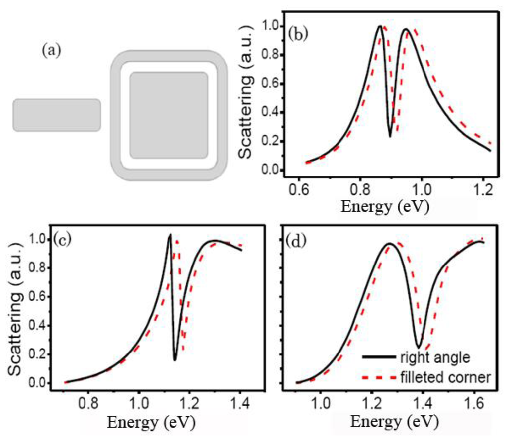 The right angle in the RCSRD in Figure 1 is very difficult to fabricate. As the RCSRD nanostructure changes from a right angle to a filleted corner, as shown in Figure 8a, the Fano dip blue shifts slightly as the cavity length becomes shorter. However, the Fano linewidth of the quadrupolar Fano resonance is nearly unchanged.