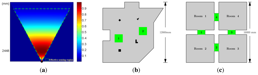 Two simulated monitoring scenes, which reflect the typical monitor requirements, are designed for experiments. One scene is called the irregular square scene, as shown in Figure 1b. The boundary of this observation scene forms a non-convex polygon. Furthermore, four obstacles, denoted by the dark blocks in Figure 1b, are placed in this scene. This test case carries the complex indoor monitoring scenes. The two green square parts are critical regions. The other is the four rooms scene, which is composed of four rectangular rooms connected by four gangways. This scene simulates the surveillance task with multiple rooms. The shape and size of this scene are shown in Figure 1c. The gangways are defined as the critical regions.