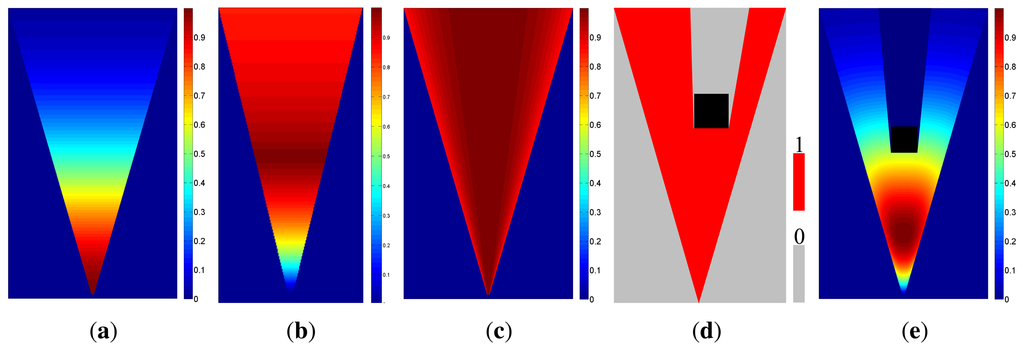 Through considering these four components comprehensively, the observation quality is measured as q(l, θ) = αFr(l, θ)Fd(l, θ)Fg(θ)Fo(l, θ), which is described in Section 2.1. The distribution of observation quality in the sensing field, which contains a square obstacle, is shown in Figure 10e.