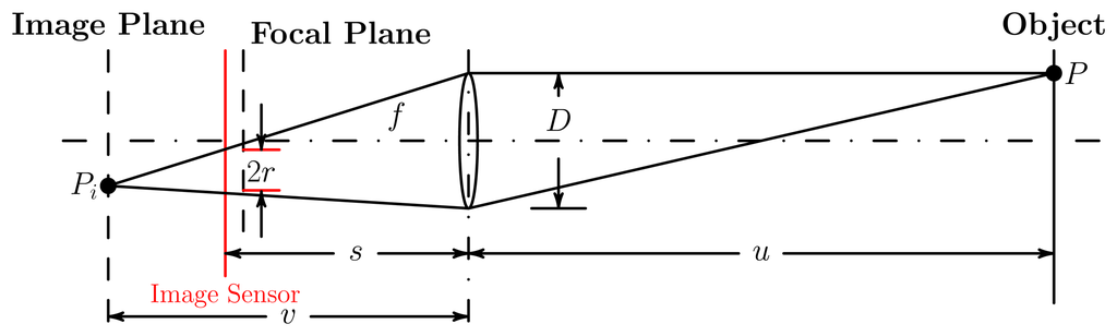 As shown in Figure 11, the distance between the image sensor (e.g., a CCD or CMOSarray) and the focused image plane, (|v — s|), is non-negligible when the object is out of focus. Thus, a point, P, of the object is imaged as a blur circle of radius, r, i.e., the defocus. The calculation of r is given by [,] as: