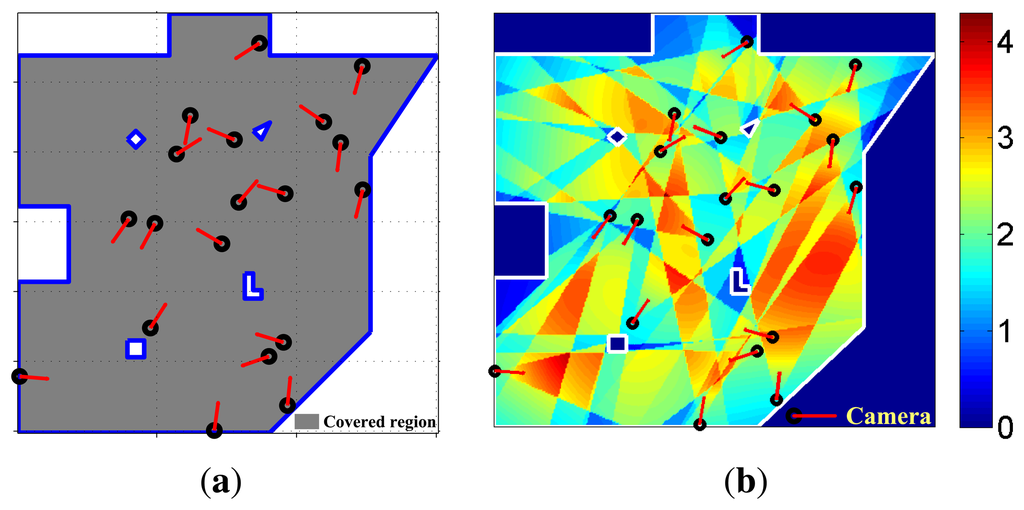 Extensive works on deployment have been done for various sensor networks. In general sensor networks, researchers mainly focus on omni-directional sensors and deploying cameras according to the energy consumption, coverage and connectivity of communication nodes [–]. For camera networks, various deployment schemes have been investigated. Approaches employing integer programming [,] are proposed for optimizing the coverage based on the binary sensing model. Sensors with the binary sensing model can sense the object in its field of view with a quality of one; and the sensing quality out of its field of view is zero. To reduce the energy and bandwidth consumption in resource-constrained networks, sensor deployment strategies are designed in [–]. This literature considers only the coverage of the observed fields, which cannot comprehensively reflect the observation quality. In addition, the concept of multiple level coverage, or K-coverage, for short, is introduced in [] to assure that one object is detected by at least K sensors. This is of importance for binary sensing models. However, the K-coverage model makes the problem more complex, as the potential combinations of positions and poses of cameras are increased exponentially.