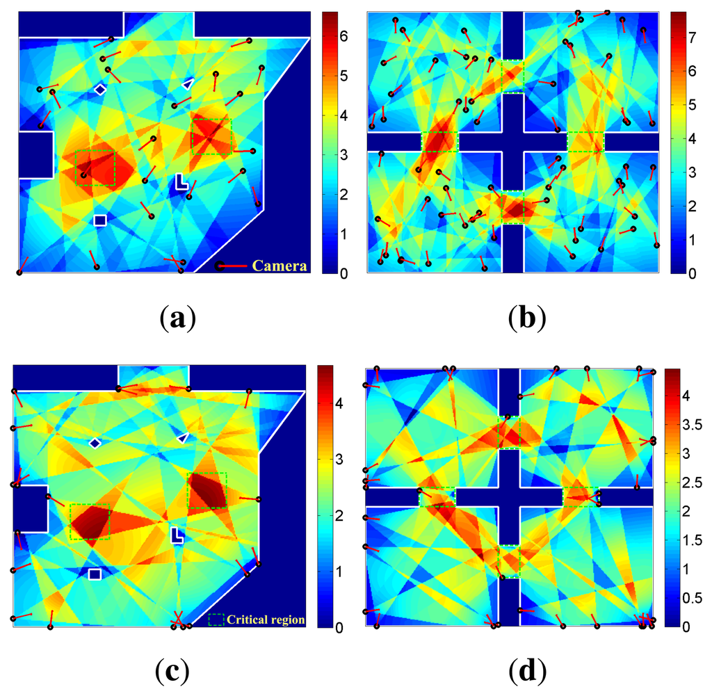 Camera networks, as a special category of senor networks with all nodes being cameras, collect comprehensive and reliable visual information of regions being monitored based on well-planned deployment of cameras in the scene. It is widely applied in traffic management [], security monitoring [], agricultural production [], virtual reality [], intelligent surveillance [], stereo reconstruction [], etc. The node deployment, which aims at optimizing both the quality of captured information and the cost of visual information acquisition, is an essential step in camera network related applications [].