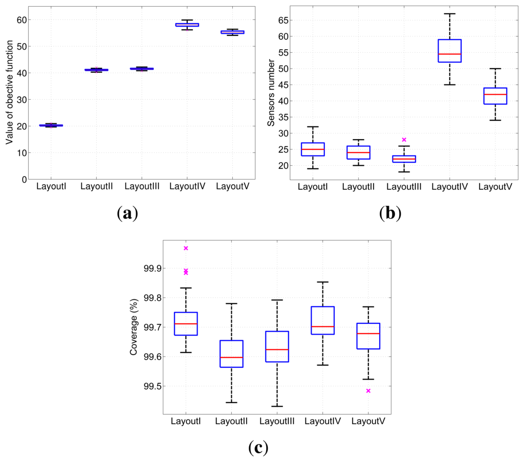 The stability of the values of objective function (8) reflects the convergence of the layout optimization algorithm. Boxplots of these values for the five layout experiments are given in Figure 5a. As shown in the figure, the values of objective functions (8) for the five experiments are quite stable. This result proves that there exists a large number of high quality solutions with similar objective values among the optimal solution, and they can be effectively obtained by the proposed algorithm with random initial camera layout.