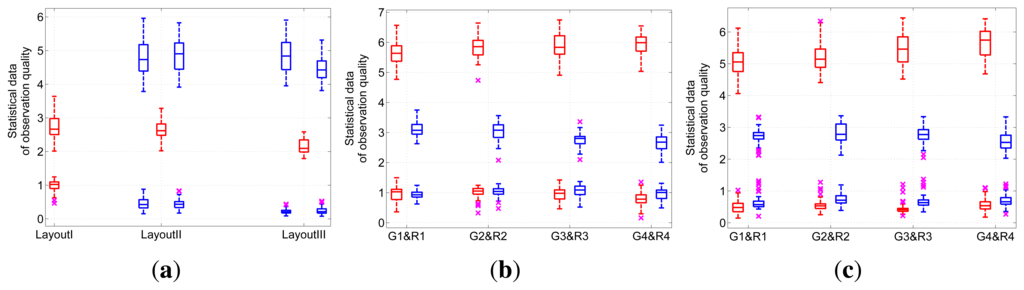 The first three layout experiments in the irregular square scene are tested, firstly. Figure 6a shows the statistical data of the observation quality distribution of these three layout experiments. As Layout I shows, the expectation and variance are comparatively concentrated. Boxplots of Layout II and Layout III also reflect the stability of the deployment solutions.