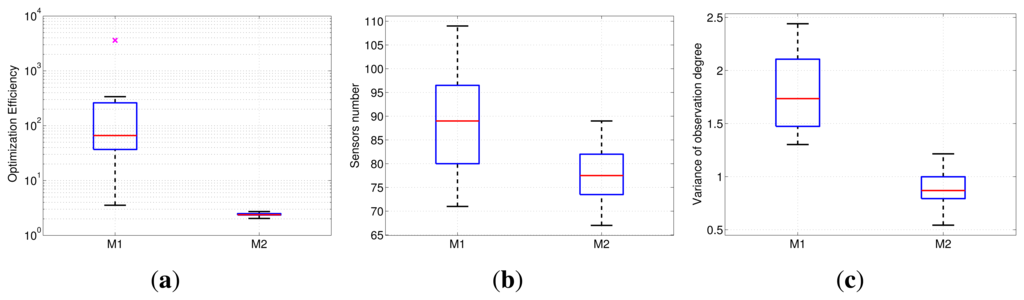 The experimental data are illustrated by boxplots, as shown in Figure 7, where each box is a collection of observation data with 20-times repeated experiments under the same parameter settings. In the experiment, each pair of results of M1 and M2 are obtained based on the same initial layout. Our optimization model has less requirement of cameras. In addition, our solution can achieve smaller variance of observation quality than the M1 result, which means a more balanced observation resource distribution in the scene. This result verifies that our approach can obtain the layout with less cameras and inhibit the excessive observation of somewhere in an equally important region, which is better than the M1 model by means of our nonuniform sensing model and a reasonably objective function.