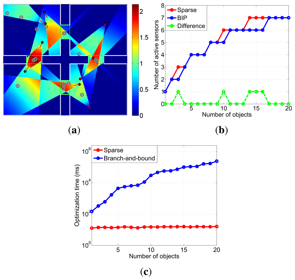 A real-time decision is indispensable to observe targets without interruption in practical application, such as object tracking. If the assignment objective function (9) is directly solved by BIP without any convex relaxation strategy, the decision time becomes unacceptable when the number of cameras and objects are large. However, our approach can obtain the active cameras within a few milliseconds by using the sparsity of assignment. Then, comparisons of optimization performance and efficiency between BIP and the sparse approach are made, respectively. We adopt MATLAB function bintprog as the optimization function of BIP. The number of active cameras obtained by BIP is viewed as the optimal solution, i.e., the least number of active cameras. Based on the node layout, as in Figure 4b, the comparative data of objects numbered from 1 to 20 are shown in Figure 8.
