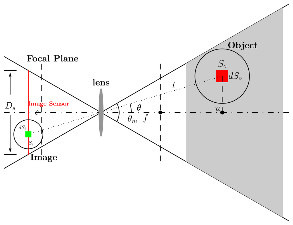 Resolution is the most intuitive factor affecting imaging quality. An image with a higher resolution can provide more details of the object. The image resolution of the object is directly determined by the area of the image and the pixel density of an image sensor. As shown in Figure 9, let dso be the area of a small part on the surface of an object and dsi the area of its image. The proportion between dso and dsi is: