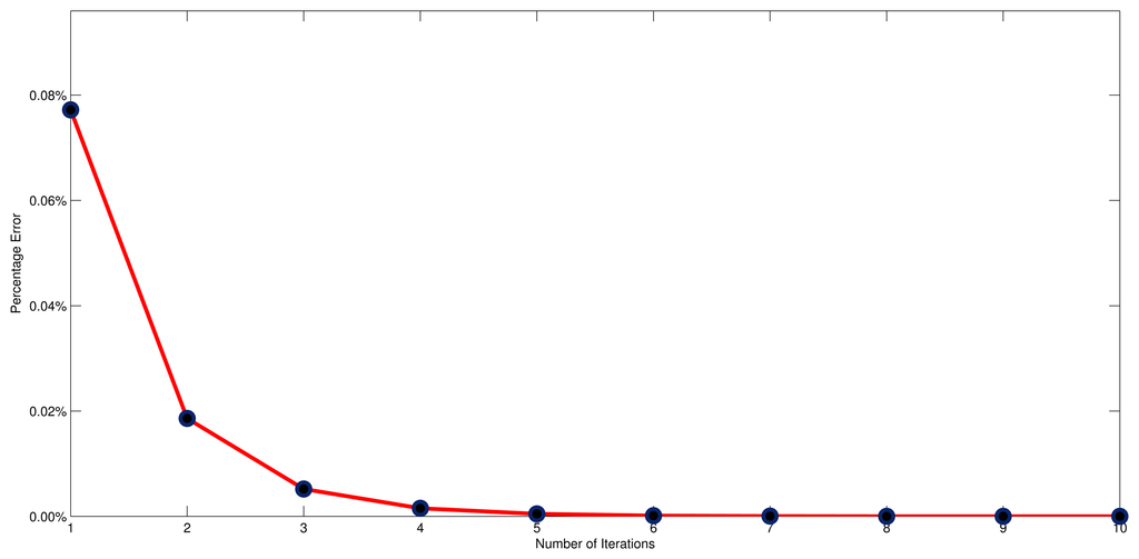 In Figure 13, it shows the tendency of the mean absolute percentage error along with the increasing of iterations, from which we can observe that the mean absolute percentage error has significantly reduced, from 0.08% to 0.01% in the first three iterations. This observation demonstrates that the adaptive NEC system has the ability to eliminate the steady state error. Moreover, the mean absolute percentage error uniformly converges to zero once the number of iterations is large enough, and the convergence rate is approximately O(ln). The reduced rate suddenly slows down from the fourth iteration, however. Taken together, this indicates that the most reasonable number of iterations is three, since this gives a desirable response without extra cost.