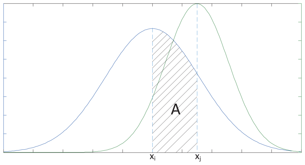 Based on the NEC model, we can assume that the measured data of Sensori and Sensorj are xi and xj, respectively, which both follow Gaussian distribution. Their density functions, Pi(x) and Pj(x), respectively, can be used for the performance description of the sensor arrays. xi and xj are observed values of Xi and Xj, respectively.