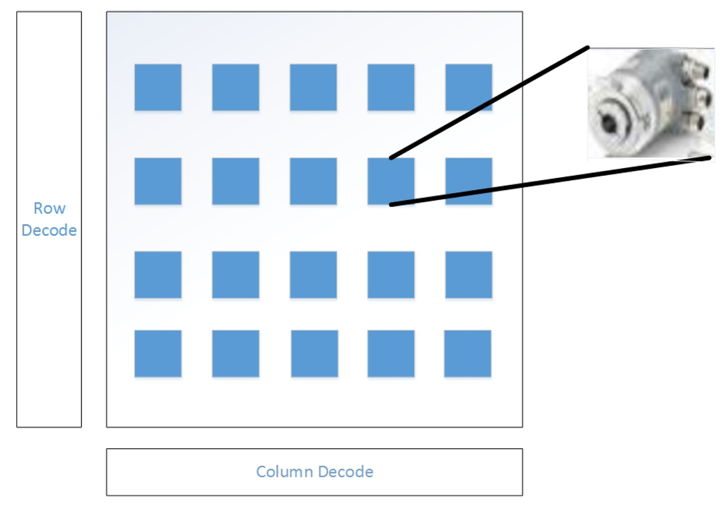 In Figure 6, it represents the architecture of the sensor arrays. Assuming that all the sensors are arranged as n-by-n matrices, log2n signals are needed for row decoding and log2n are for column decoding. Therefore, 2 log2n signals are all that is needed for locating any sensor at any position. There are two types of data the sensor arrays will transmit to the DC during data processing: the position signal and measured data. After cross communication between the row decoded signals and column decoded signals, the one-to-one relationship between the position of any sensor and its measured data can be established.