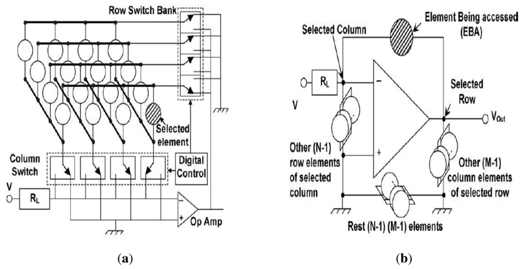 The proposed circuit for a 4 × 4 sensor array is represented in Figure 7a for illustration of the scheme. However, the analysis is applicable to any N × M sensor array As shown in the Figure 7a, the columns and rows are connected to two digitally controlled single pole double throw switch banks, which allows connecting of any column to the load resistor, RL, and any row to the output node of the operational amplifier, with all other rows and columns staying connected to the ground. The element being accessed comes in the negative feedback path of the Operational Amplifier (Op Amp), as represented in Figure 7b. The other N − 1 sensors connected to the selected column make a parallel combination across the two inputs of the Op Amp, with non-inverting inputs connected to the ground. Similarly, M − 1 elements connected to the selected row get connected to the output node of the Op Amp with their other end grounded. The rest of the (N − 1) × (M − 1) elements, not physically connected to the Elements Being Accessed (EBA), have both of their ends at the ground [29].