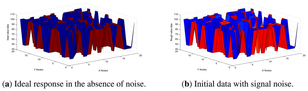 In order to simplify the UDS system, the experiments are based on a sample of sensor arrays, represented as matrices on the order of twenty by twenty. It makes the comparison of initial data between the ideal response, response in the absence of noise, and response with signal noise. The height of the semi-finished products is 50 cm, so the default distance of the parallel lines with none of the products passing by in the workshop that we used for experiments is also 50 cm. Therefore, the ideal value matrix has elements with value either 50 cm or 100 cm. Considering that interference highly depends on the position of the sensors in this model, we have obtained the initial data.