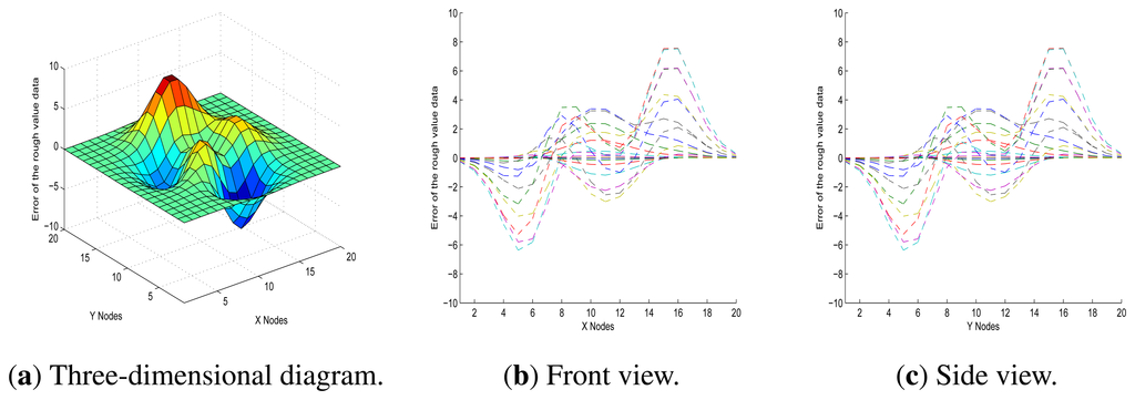 In Figure 9, it shows the front and side views of a three-dimensional representation of the initial data errors, which is a better visualisation than that in Figure 8, since it is in relative terms and demonstrates more clearly the association between measurement error and noise from the environment. Furthermore, in Figure 9, it also shows that there is little difference between the front view and the side view. One plausible explanation is that the error function graph of each node is approximately symmetrical with rotation around the perpendicular. Based on these factors, we decided to focus on the front view for this model.