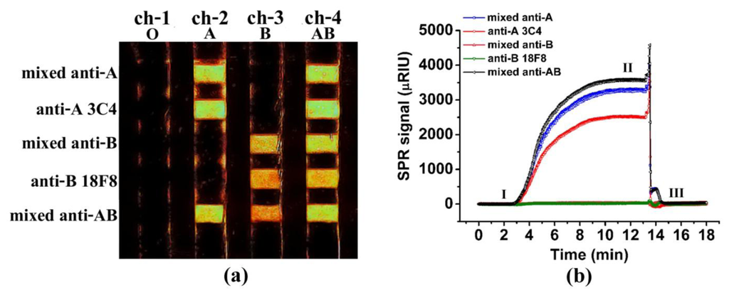 Figure 1b shows the sensorgram, a plot of the SPR signal change as a function of time, as the A-RBC sample (ch-2 in Figure 1a) passed over the detection antibodies. Point I was the baseline signal after immobilization with the detection antibodies and before the injection of the RBC sample. Point II was the point where the signal reached the plateau after injection of the A-RBC sample for 12 min. The SPR signal returned to the baseline at Point III, when the bound A-RBCs were removed from the surface using 5.0 mM NaOH and the sensor surface was ready for use in subsequent detections. We found that the sensor was suitable for reuse at least 20 times. As expected, the SPR signals increased only for the surfaces that contained anti-A (mixed anti-A, anti-A 3C4, and mixed anti-AB). There was a negligible change in the SPR signal for the surfaces without anti-A (mixed anti-B and anti-B 18F8) (Table 1).