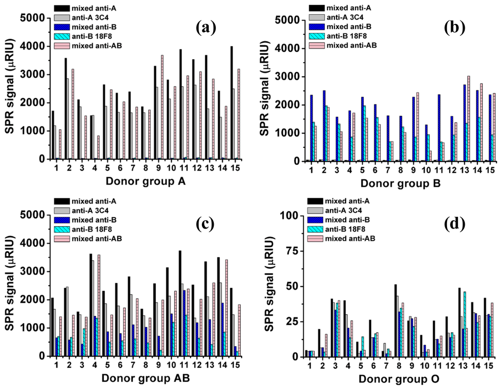 Surface plasmon resonance (SPR) is an optical technique that measures the surface mass coverage of an adsorbed material [1–4]. SPR is a sensitive technique for studying the interactions between immobilized biomolecules and a solution-phase analyte. The sensitivity and versatility of this label-free, real-time method has advantages for some applications over conventional methods, such as fluorescence or ELISA (enzyme-linked immunosorbent assay). Commercially available SPR systems, such as the Biacore system (Uppsala, Sweden), are well-known and commonly used in many experiments [5–10]. The ABO blood system was the first blood type system [11], and it is also the most clinically important system with regard to blood transfusion. There are several techniques available for blood typing, including gel agglutination [12,13] and SPR [14,15]. The use of SPR to specifically detect the A or B antigens on whole red blood cells (RBCs) was first reported by Quinn et al. [16]. The authors reported the high specificity of monoclonal anti-A IgM for A erythrocytes without non-specific binding to B or O erythrocytes. Likewise, a monoclonal anti-B IgM exhibited specific binding to B erythrocytes and no non-specific binding with A or O erythrocytes. Blood from a single donor was used in the experiment for each blood type to avoid variations in the signal between different donors. SPR imaging is a promising platform for use as a high-throughput bioanalyzer in protein analysis [17–19]. These previous reports suggest that there is a possibility of using SPR imaging as a high-throughput technique for ABO blood-typing.