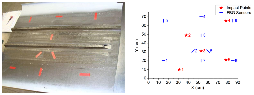 In Table 1 it is possible to check the different positions of the Bragg sensors and the impact points. The second column represents the x-coordinate (i.e., in the horizontal axis), measured in cm, of the location of the sensor. The third column stands for the y-coordinate (i.e., in the vertical axis) of that location. The last column is the angle made by the direction of the sensor with the x-axis. The orientation of the FBG in a certain direction does not have any effect on the measurement of the strain.