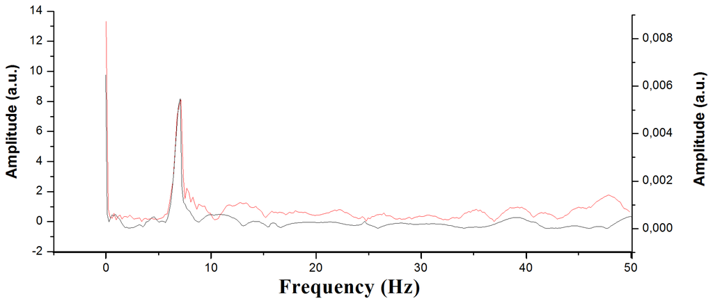 To demonstrate the improvement obtained when using an interrogator with a higher sampling speed, the Fast Fourier Transform (FFT) was applied to both signals. The goal was to determine which part of the impact signal was not collected when using a low-frequency interrogator. The FFT limits for the data collected by the interrogator of 100 Hz were from 0 to 50 Hz, and the limits extended up to 10 kHz for the 20 kHz interrogator. The FFT serves us to know if there are non-negligible spectral components of the signal between 50 Hz and 10 kHz. If not, a 100-Hz interrogator would yield the same results as a 20-kHz one. However, the FFT results clearly show that the high-frequency values cannot be neglected, which means that information is lost with the low-frequency interrogator. When comparing the results obtained by the two interrogators applying the FFT up to 50 Hz, we can create graphs such as Figure 10. The data obtained are basically identical; the only difference lies in the range, due to the fact that the measuring method is different in both interrogators.